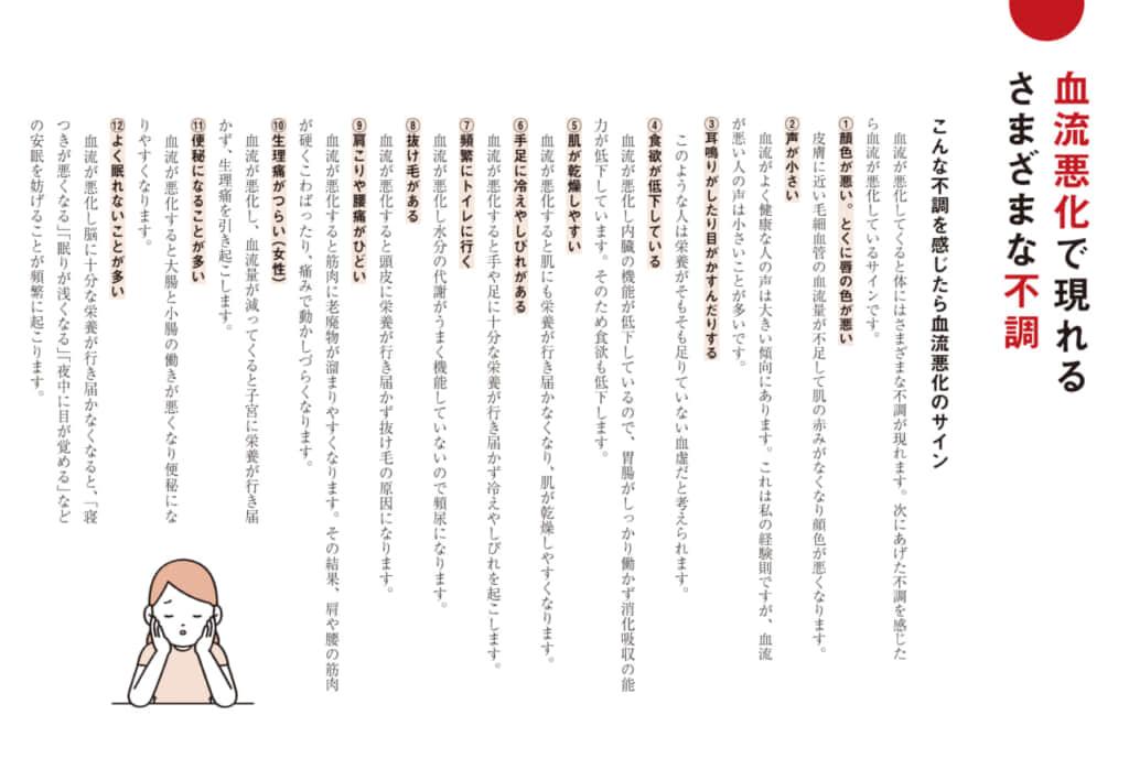 ストレス、抜けない疲れ、不眠、腰痛、肩こり、首こり、冷え、むくみ、高血圧、肥満、生理痛、耳鳴り、目のかすみ、食欲不振、手足のしびれ、頻尿、抜け毛、便秘、乾燥肌……。これらのさまざまな不調には、実は血流の悪化が深く関係しています。