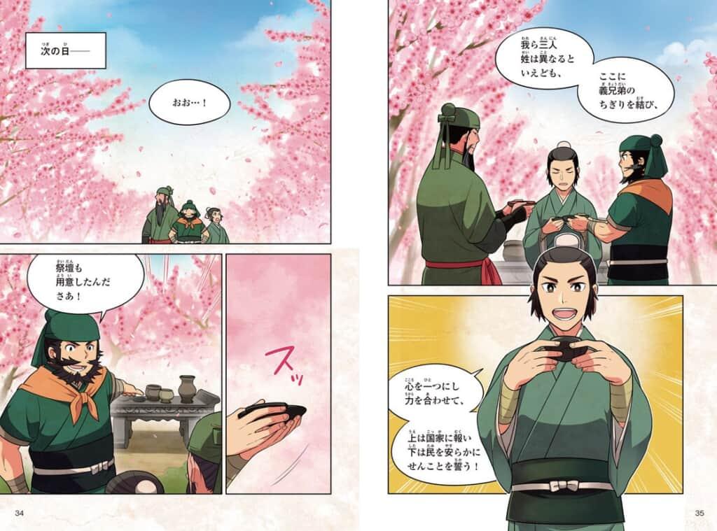 - 桃の花の咲きほこる中で義兄弟の契りを交わす「劉備」「関羽」「張飛」の3人