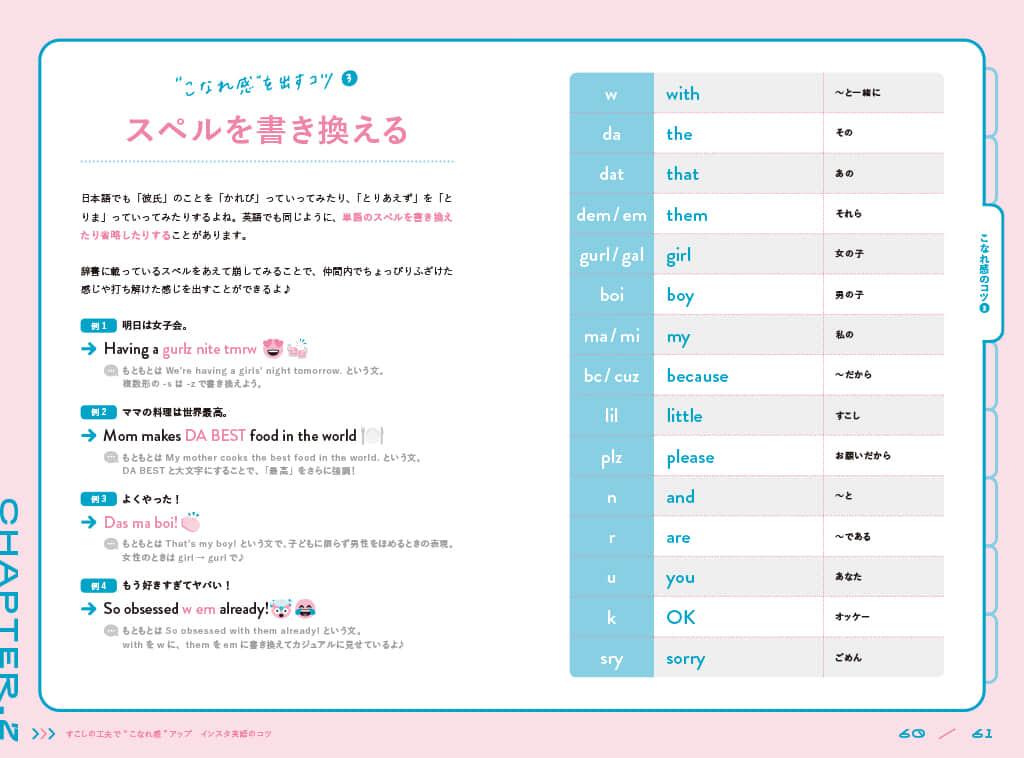 せっかくインスタグラムに英語日記を投稿するのであれば、できるだけネイティブっぽい自然な英文を目指したいですよね。本書では、日記に“こなれ感”を出すための8つのコツを紹介しています。「主語を省略する」「大文字で強調する」「スペルを書き換える」のようなコツから、ネイティブがよく使う「略語」や「間投詞」、「ちょい足しフレーズ」まで、誰でもすぐに取り組めて大活躍する“こなれ感”のコツをマスターしましょう。