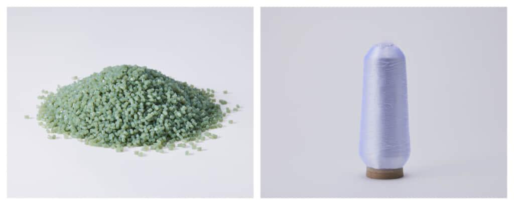 「スクールリュック UMI」で使用される廃棄漁網は、北海道の漁網回収企業にて乾燥させ洗浄し圧縮。愛知の素材メーカーに送られて、細かく粉砕され、高品質な再生プラスチックの粒になります。そしてその粒をスクールリュックに適した生地に加工。織りあげられたナイロン生地を外装部分のメイン素材として利用しています。