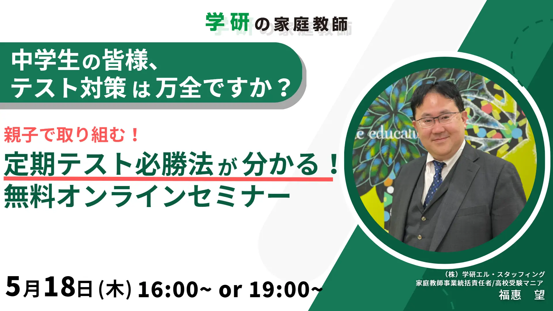 株式会社学研ホールディングス(東京・品川/代表取締役社長:宮原博昭)のグループ会社、株式会社学研エル・スタッフィング(東京・高田馬場/代表取締役社長:伊藤弘雅)は「【定期テスト対策第1弾・中学生の保護者必見!】親子で取り組む!定期テスト必勝法が分かるオンラインセミナー」を2023年5月18日(木)に開催いたします。