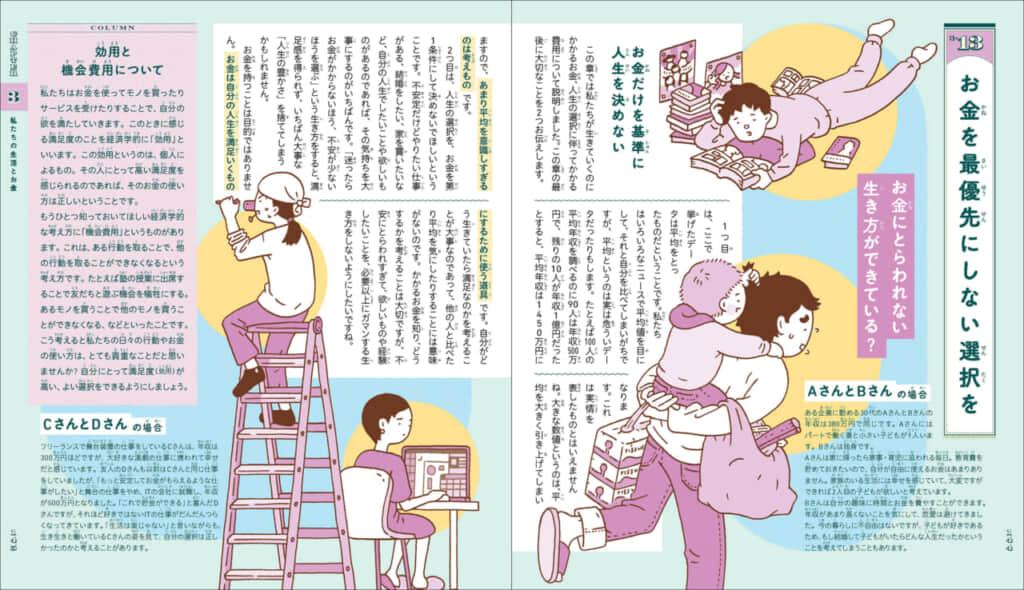 宮﨑:巷にあるお金の本というと、お金を「貯めること」と「増やすこと」にフォーカスした本が多いです。それも大事ですが、お金を貯める・増やすことを第一の目的だと、読者に思ってほしくはなかったんです。特に、この本の対象は中高生や20代30代の若い大人の方たちですから。お金はあくまで人生を豊かにするための道具のひとつ。あなたはどうお金と付き合って、どんな生き方がしたいですか? と問いかける本をめざしました。