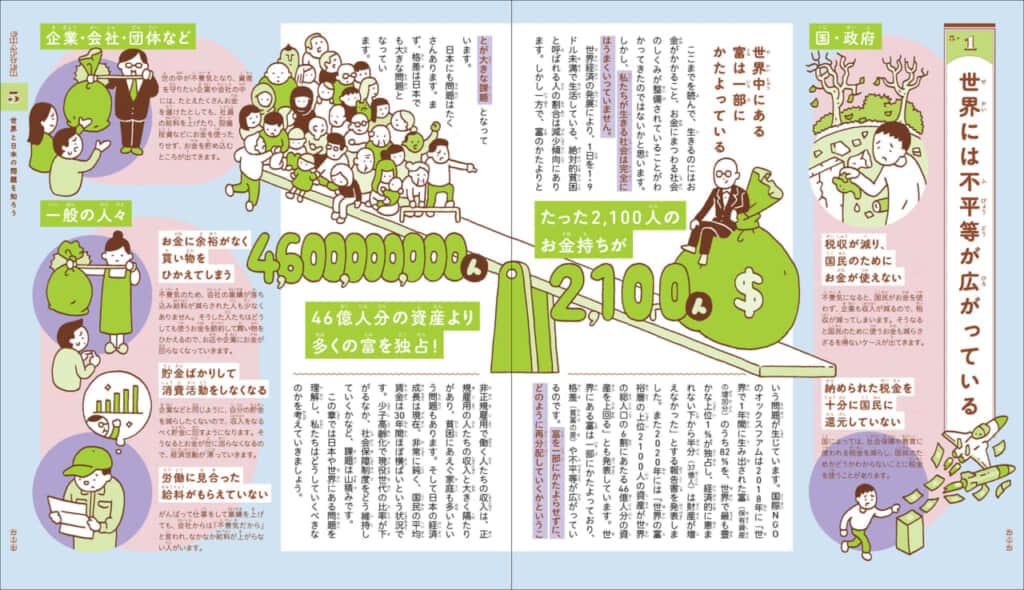 宮﨑:“お金の教育ってなんだ?”と考えたときに、やはり“世の中を知る”ということに尽きるんですよね。この社会はお金を介して成り立っていますから。ただ、社会のしくみがすべてうまくいっているわけではなく、格差や不平等など、問題も数多い。この本はそういうところにも踏み込んでいます。解決すべき社会問題に意識を向けられる子どもたち、大人たちが増えてくれるといいなと。もちろん、自分の資産を増やすにはどうするかなどということも本の中で解説していますが、個人のお金の不安を解消するだけでなく、自分以外の誰かの悩みにも目を向けてほしいという、読者のみなさんへのメッセージを込めています。