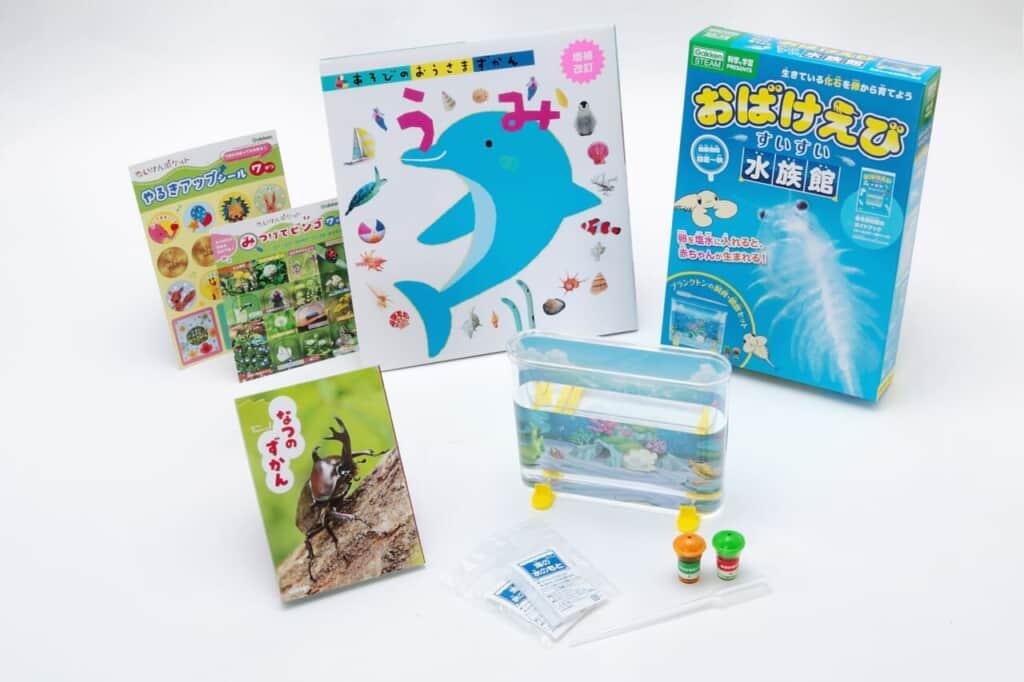 7月号では飼育・観察キット「おばけえび すいすい水族館」や「なつのずかん」「あそびのおうさまずかん うみ」「みつけてビンゴ」「やるきアップシール」をお届けします。