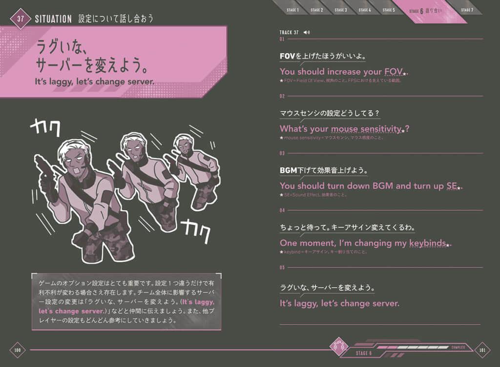 また「角待ち」「裏取り」「決め撃ち」などのFPSに使える用語や、「gg」などのチャットで使える略語も収録されているほか、「FPSに使える韓国語」「センスのある煽り」などのコラムもついた、充実の内容となっています。