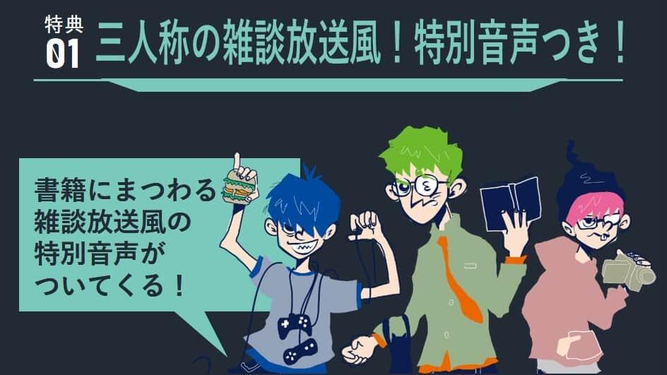 特典の1つめは「雑談配信風の特別音声」。三人称のYouTubeで人気の雑談配信を再現した特別音声がついてきます!他では聞けない本書限定の音声を、ぜひお聞きください。