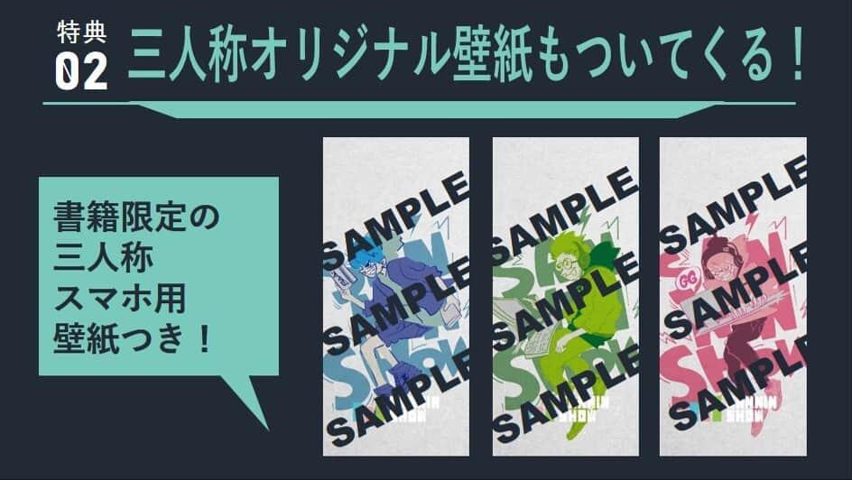 特典の2つめは「三人称のオリジナル壁紙」! メンバーであるドンピシャさん・ぺちゃんこさん・鉄塔さん全員分のオリジナルスマホ壁紙がついてきます。こちらも書籍でしか手に入らないイラストですので、ぜひチェックしてみてください。