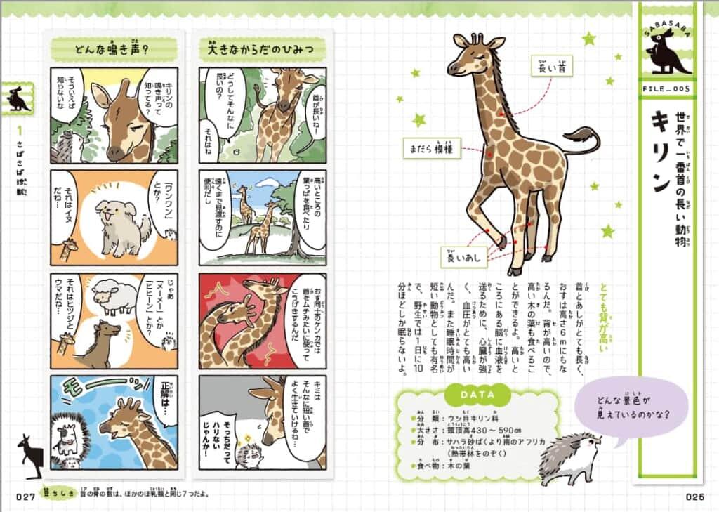 1章では、とても背が高いことで有名なキリンや、砂ばくという過酷な環境にくらすスナネコなど、草原や砂漠にすむ珍獣たちが登場します!