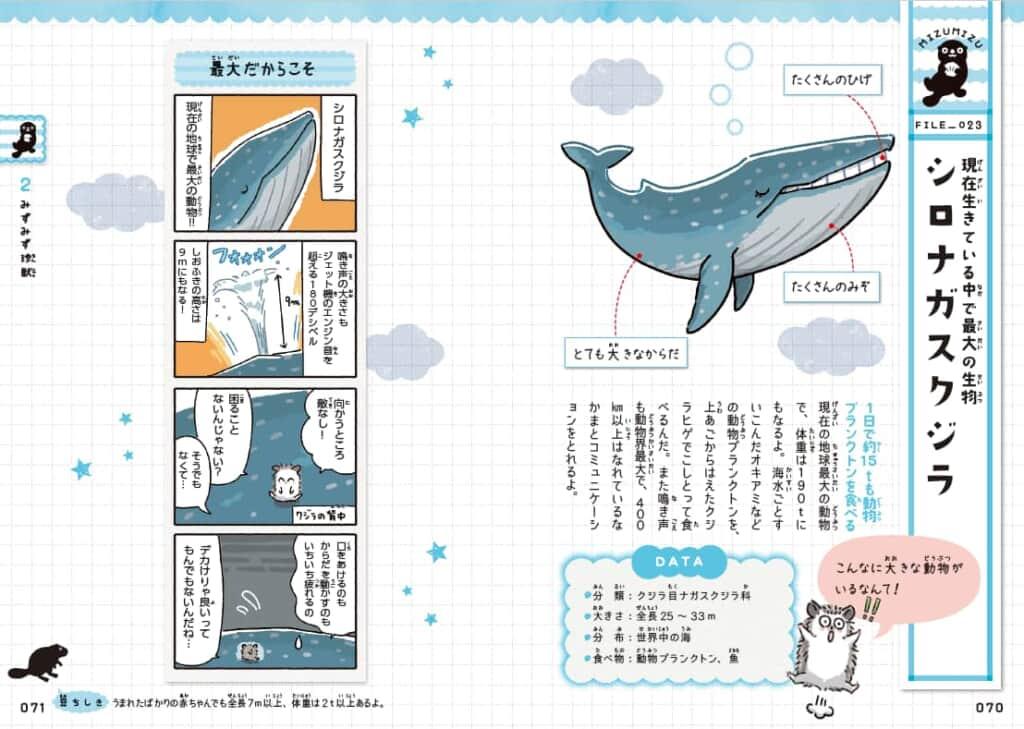 2章の主役は、世界でゆいいつ淡水にすむアザラシのバイカルアザラシや、現在生きている動物の中で一番大きなからだをもつシロナガスクジラなど、水辺にすむ珍獣たち!