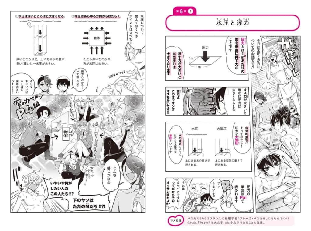 - 水圧と浮力の解説部分。「物理・化学」も、ギャグ満載、勢い抜群!