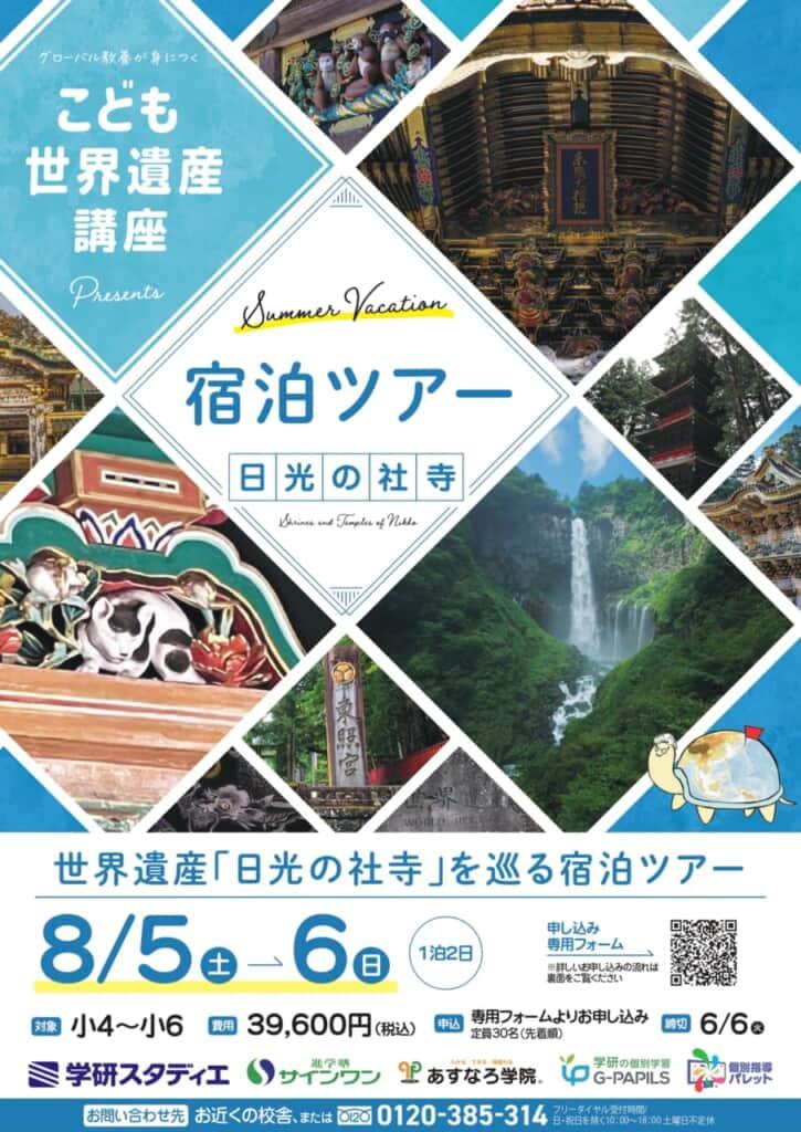 株式会社 学研ホールディングス(東京・品川/代表取締役社長:宮原博昭)のグループ会社、株式会社 学研スタディエ(さいたま市/代表取締役社長:亀谷眞宏)では、令和5年4月より、「グローバル教養が身につく こども世界遺産講座オンライン」を開講。国際教養教育による真のグローバル人材の育成と、グループワークをふんだんに取り入れた非認知能力の育成を目指しています。今夏は、もっと子ども達に世界遺産を身近に感じていただける、1泊2日、世界遺産「日光の社寺」を巡るツアーを開催します。