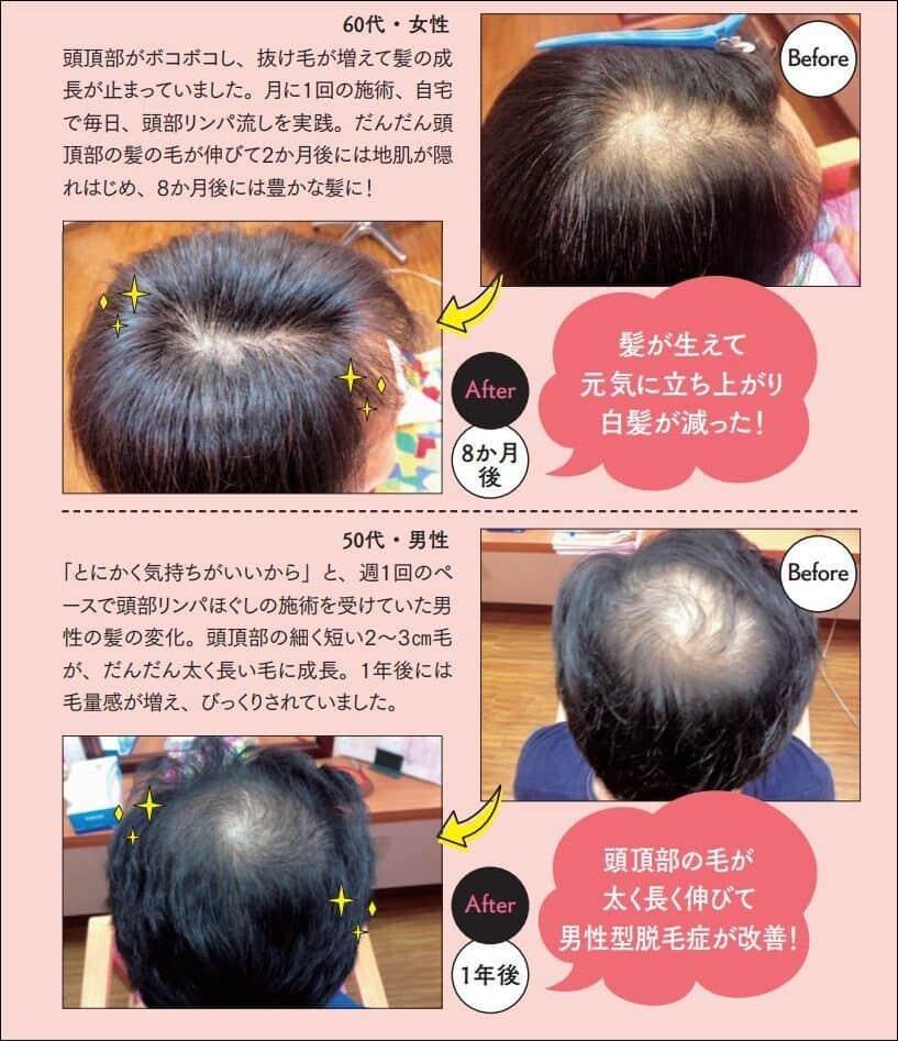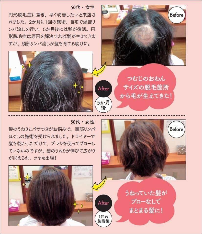 - 「頭部リンパ流し」によるお悩み改善例。薄毛、白髪、うねりなど、さまざまな髪トラブルの改善が期待できます