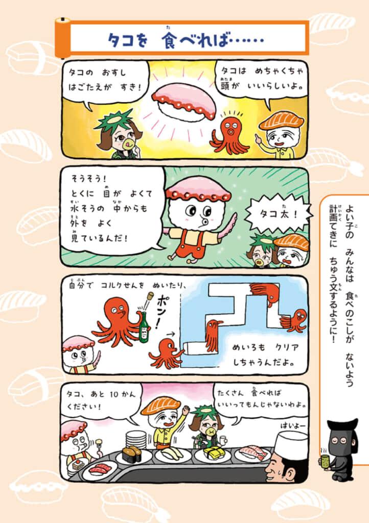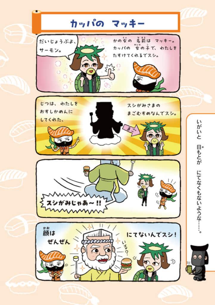 今回、マンガサイト「ガッコミ」にて連載されている、本作の4コマまんがを電子書籍化。主人公のおすしかめんサーモンの活躍はもちろん、個性的なキャラクターたちが織りなすギャグがふんだんにもりこまれています。また、サーモンやカッパ巻きなどのおすしネタや、タコやイカなどの魚介類のマメ知識なども学べる学習マンガ的内容にもなっています。