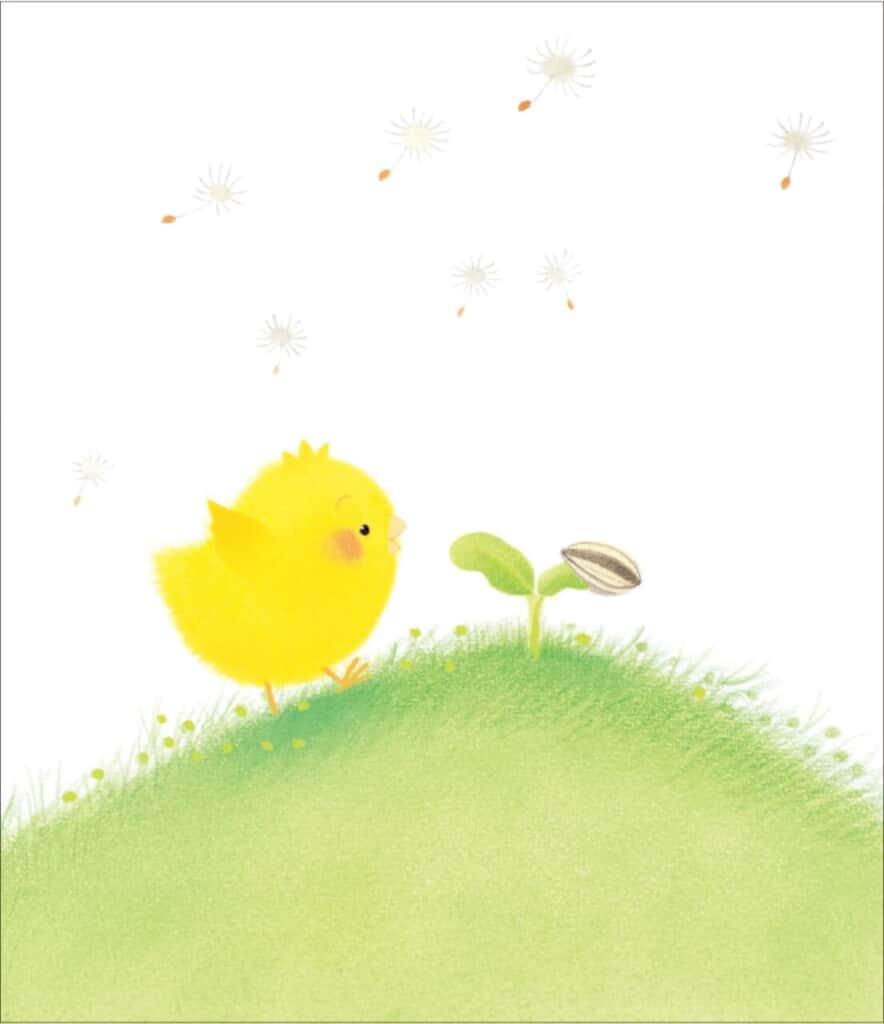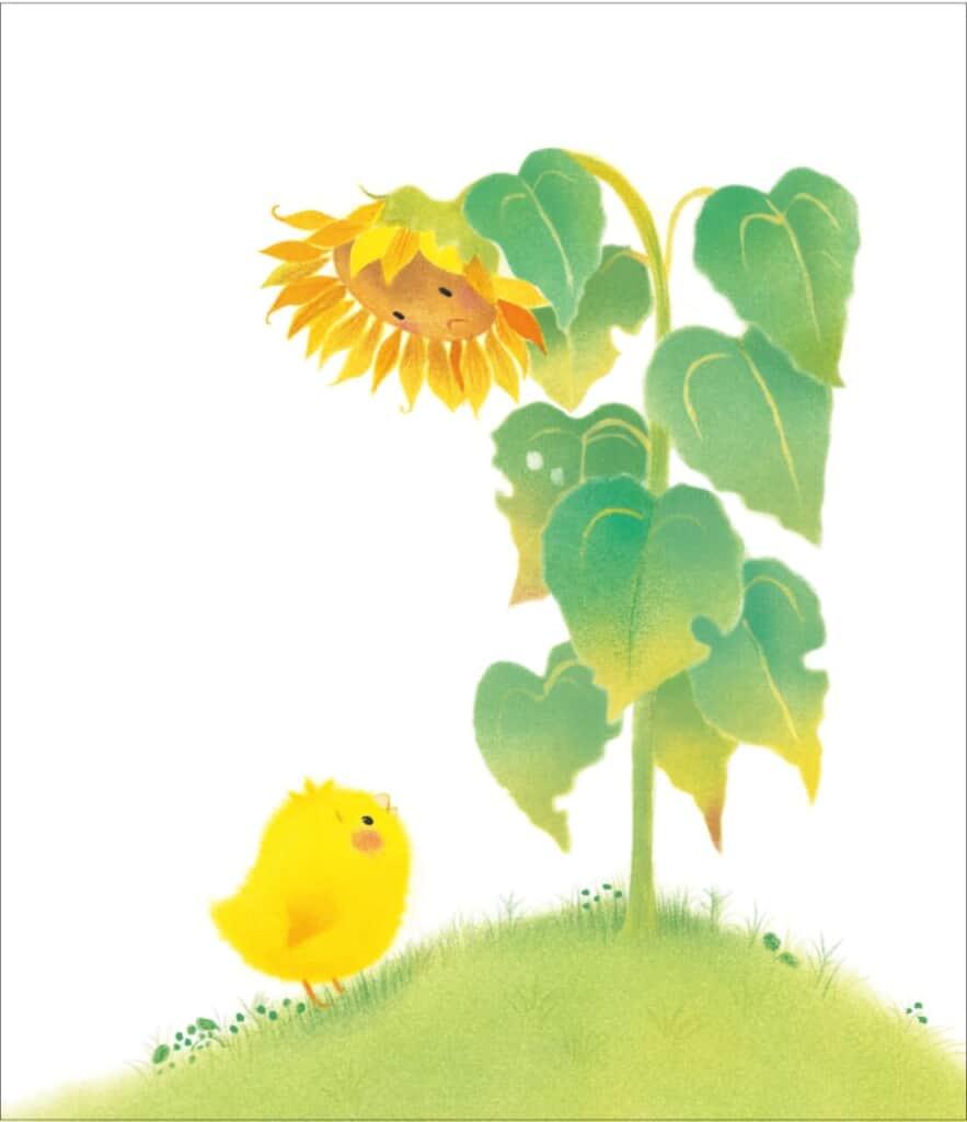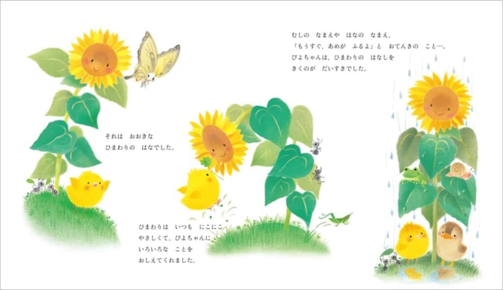 かわいいぴよちゃんとひまわりの出会いが優しいパステルタッチで描かれます。