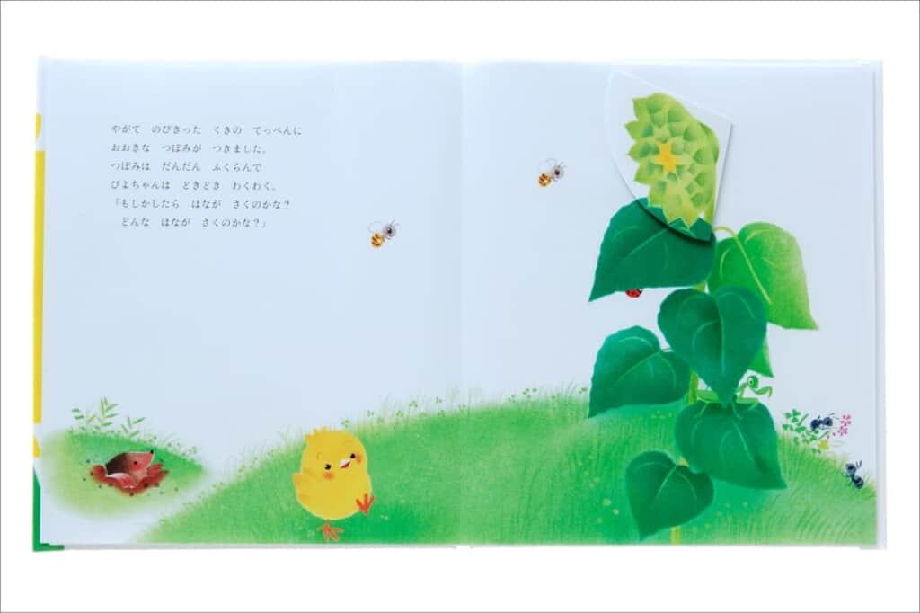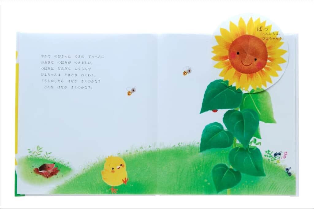 - 『ぴよちゃんと ひまわり』本文ページ。しかけのつぼみを開くと…