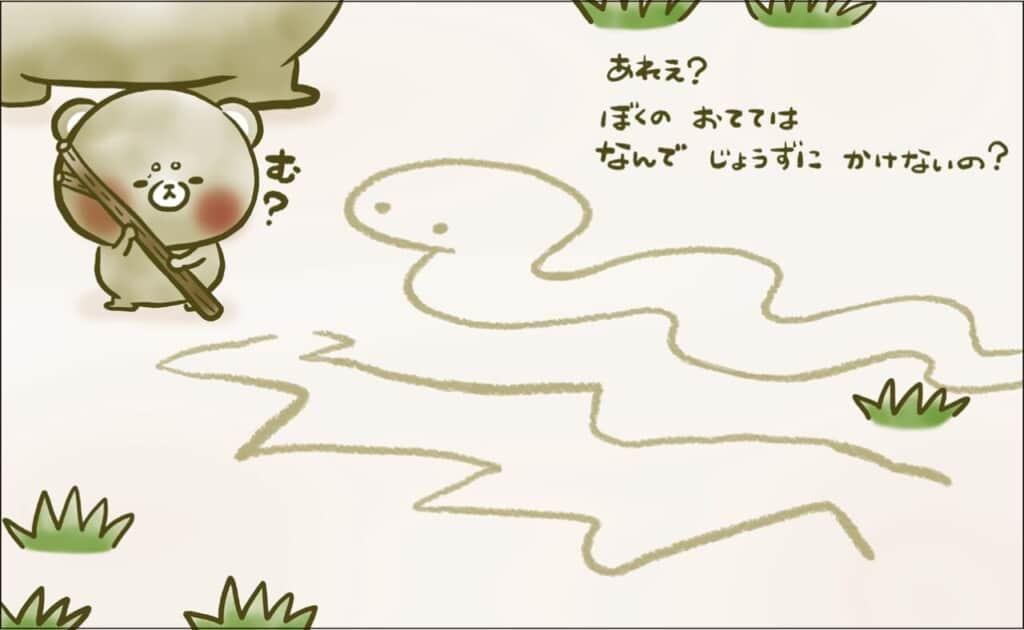でもいろんなことを考えているし、やる気いっぱいの子どもです。しかし、まだ小さいので、なにをするにも、うまくできません。地面におえかき。でも、思い描いているような上手な絵を描くことができません。パパはとってもじょうずなのに。