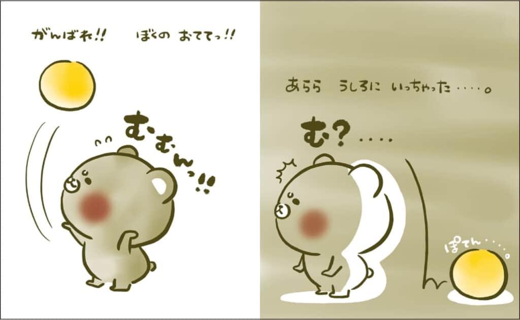 - こぐまのむうくんシリーズ『パパの おてて』電子書籍本文ページより。主人公むうくんはパパのマネをしてボールを投げますが…