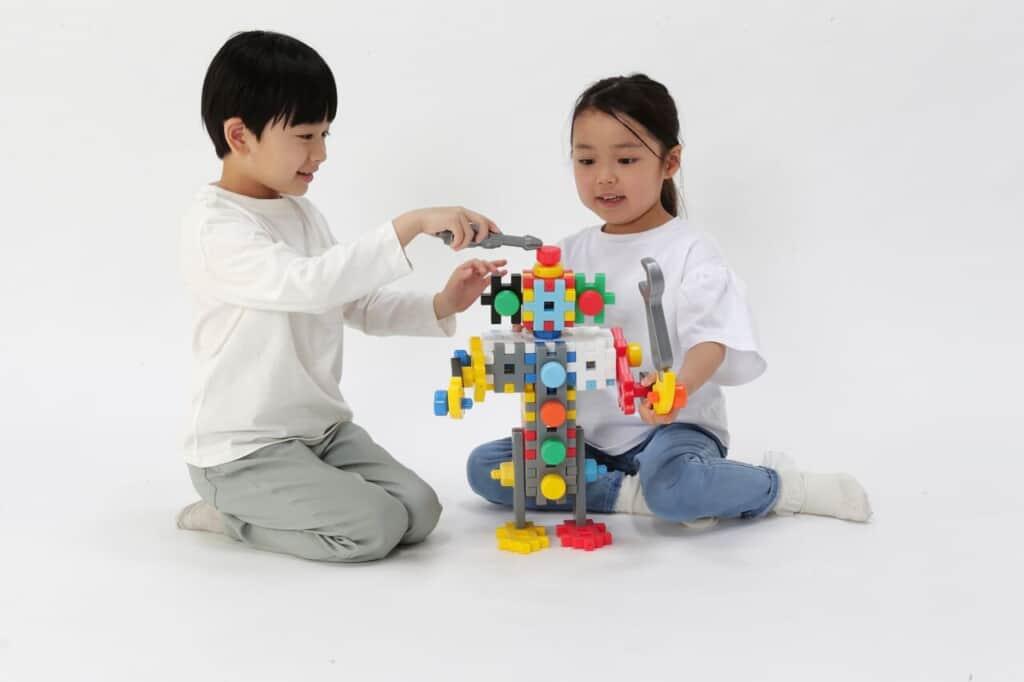 くぎ、ねじ、ナットのパーツに加え、トンカチ、ドライバー、レンチが入ったセット。遊びながら工具を使うことで、右手と左手の協応作業を行う高度な体験ができます。また、手足が可動するロボットなど動きのある作品を作ることができ、ブロック遊びの幅が広がります。
