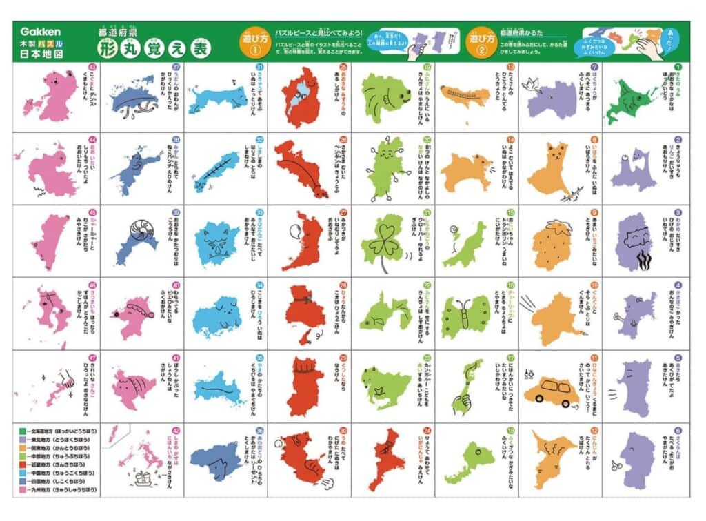 付属の「都道府県形丸覚え表」には、都道府県の形を動物や物などに例えたイラストと面白い語呂合わせを掲載。目でも耳でも楽しみながら覚えることができます。