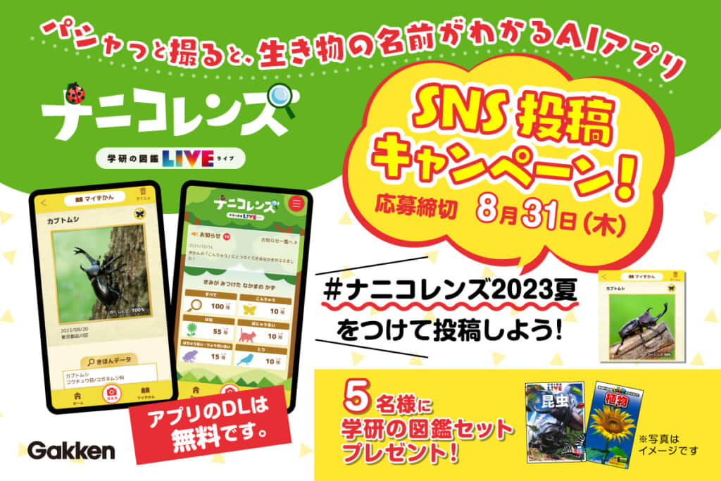 株式会社 学研ホールディングス(東京・品川/代表取締役社長:宮原博昭)のグループ会社、株式会社 Gakken(東京・品川/代表取締役社長:五郎丸徹)は、iOS・Android対応アプリ「ナニコレンズ」で撮った写真をSNSに投稿すると抽選で5名様に「学研の図鑑LIVE」「学研の図鑑LIVEポケット」シリーズから、それぞれお好きな図鑑2冊をセットにしてプレゼントする「夏の投稿キャンペーン」を2023年8月31日まで実施中です。