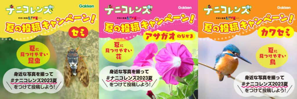 ◆応募要項:応募されるSNSの「学研の図鑑」公式アカウント①Twitter(@gakken_zukan)または②Instagram(@gakkenzukanclub)をフォローのうえ、期間中にナニコレンズで撮影した夏の生き物、花の「マイずかん」のスクリーンショットを「#ナニコレンズ2023夏」を付けて投稿してください。期間中、何度でも応募(投稿)可能ですが、当選はお一人様一回に限らせていただきます。応募規約はこちらをご確認ください( https://gakken-ep.jp/extra/nanicolens_cp_hana2023_kiyaku/summer.html )。