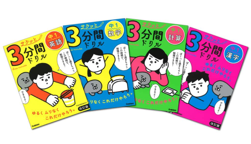 - 左から、「中1英語」「中1数学」「中1計算」「中1漢字」。表紙には、「ぼーっと過ぎてしまう3分間」のあるあるシチュエーションが描かれている。