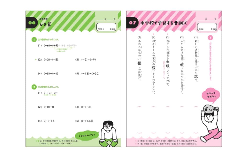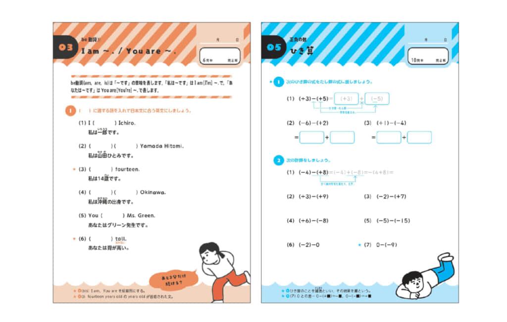 - 1回分は1ページ。左から、「中1英語」「中1数学」の誌面。