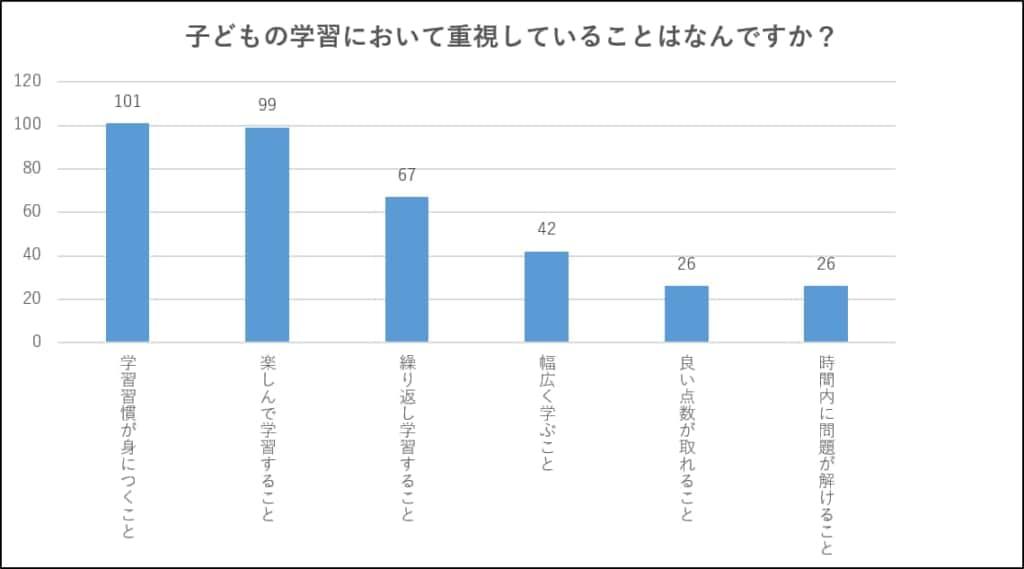 子どもの教育についての考え方は家庭によって千差万別ですが、重要視している事の1位は「学習習慣を身につけること」、2位「子どもが楽しんで学習すること」、3位「身につくまで繰り返し学習すること」となっています。