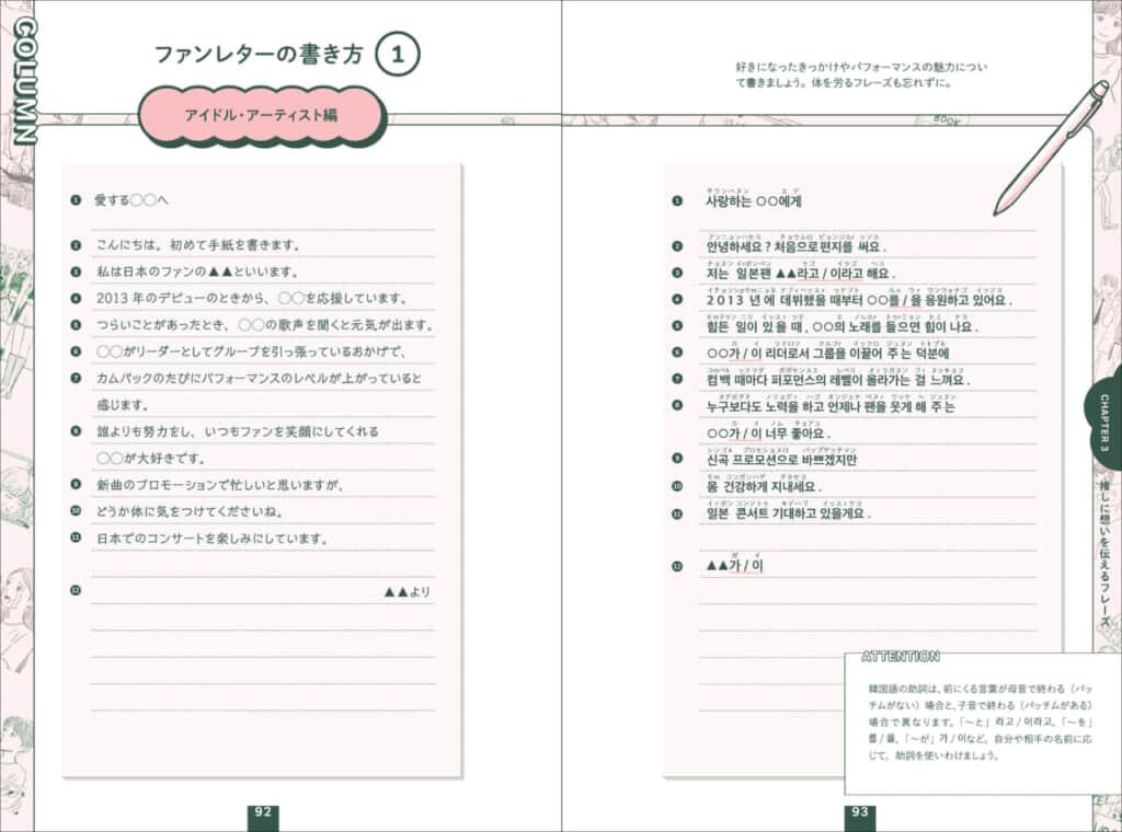 イベント参加者が韓国語で書いたファンレターの公開添削も実施されました。兵役期間中の推しには、군대 생활 어떻게 지내고 있어요?(クンデ センファr オットケ チネゴ イッソヨ)「軍隊の生活をどのように過ごしていますか?」という書き出しがオススメ。推しに愛を伝える表現사랑해요(サランヘヨ)「愛しています」は、사랑해용(サランヘヨン)のように語尾を変えると「愛していますよん」といったかわいいニュアンスに。さらに、上の歯で下唇を噛みながらしゃべるイメージで스릉흔드(スルンフンドゥ)と書くと、推しへの愛がより強調されるとか。