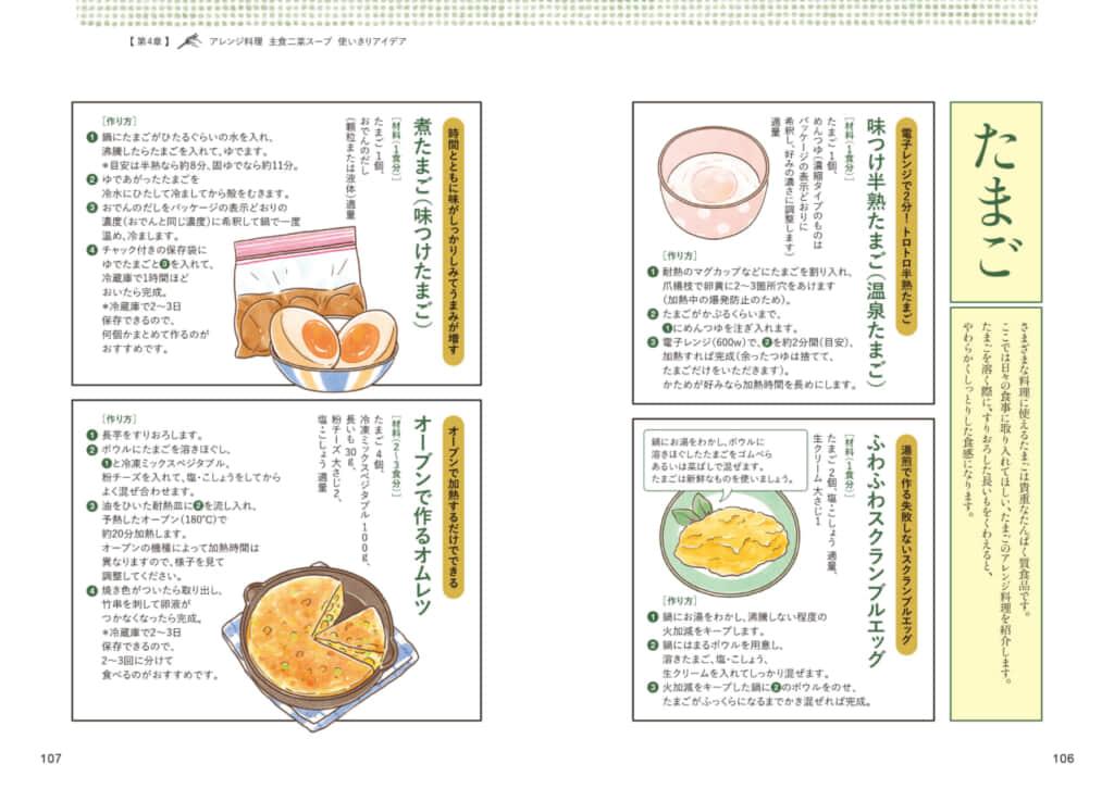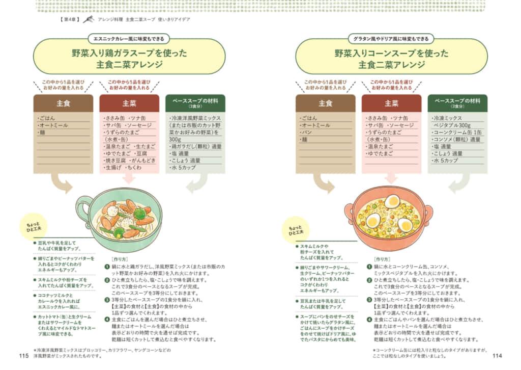 - ひと皿で主食・主菜・副菜がまとめてとれる「主食二菜スープ」のレシピや、量が多くて1回では食べきれない「豚肉・牛肉、鶏肉、ブリ、鮭・タラ」を飽きずに食べきる方法などもご紹介しています。