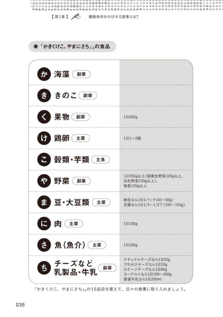 - 「かきくけこ、やまにさち」Ⓡという筆者考案の食事法なら、1日10品目を食べるだけで、三大栄養素とビタミン類・ミネラル類がまんべんなくとれ、低栄養を防ぐことができます。