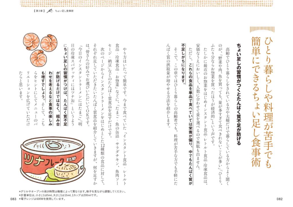 | 【本書のおもな内容】 序 章 何歳からでも食事次第で健康になれる 第1章 健康寿命をのばせる食事とは? 第2章 たんぱく質を優先した食事のすすめ 第3章 ちょい足し食事術 第4章 アレンジ料理 主食二菜スープ 使いきりアイデア 第5章 健康寿命をのばす食事のコツ 第6章 日本人にしのびよる新型栄養失調 |
