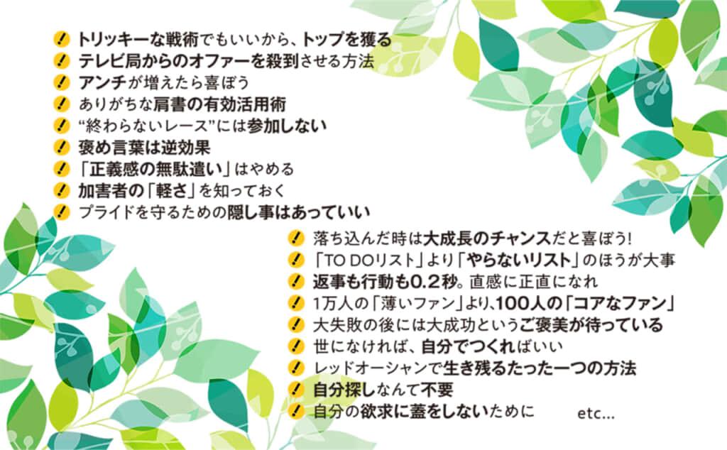 そんな3つの力を背景に、本書は全6章で構成。「人に恵まれる」がテーマ第の1~3章では、何かをするときに強力な仲間に動いてもらえるようになる方法を。「夢を叶える」をテーマにした4~6章では、好きなことをなるべく無理なく実現させるための方法をお伝えしています。