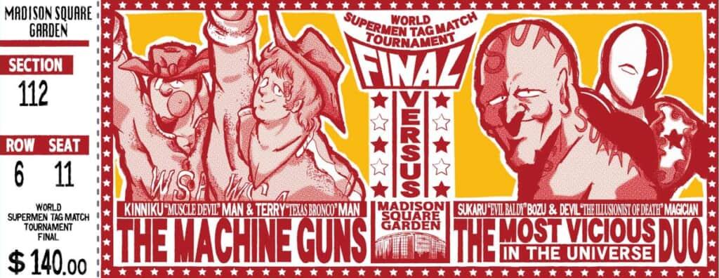 2枚目は通なファンに評価が非常に高い「アメリカ遠征編」からザ・マシンガンズ対宇宙一凶悪コンビの世界超人タッグ選手権の決勝戦チケット! 1980年代のプロレスのチケットやポスターのエッセンスと雰囲気を取り込んだデザイン性が光ります!
