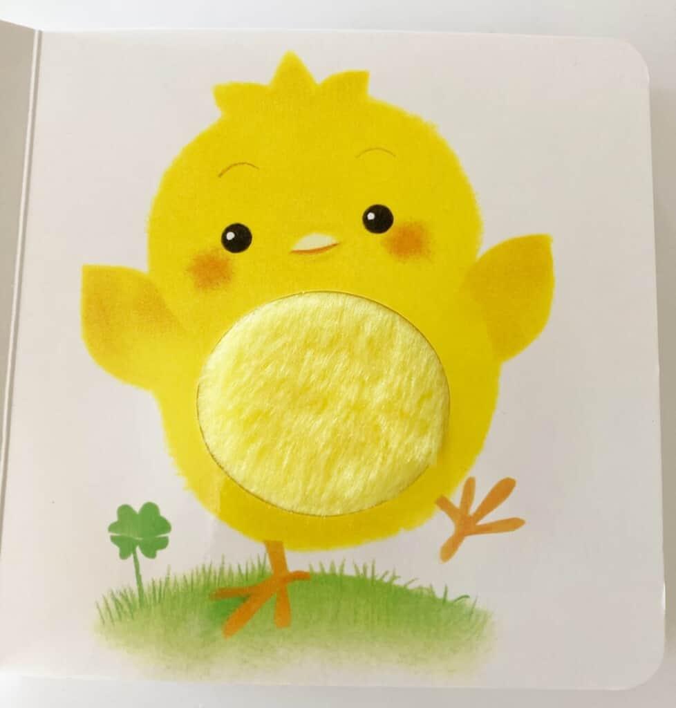 - 『ふわふわ だあれ?』本文ページ。表紙のおしり側の振り返り顔のぴよちゃんをめくると、顔がはっきり見える正面のぴよちゃんが!