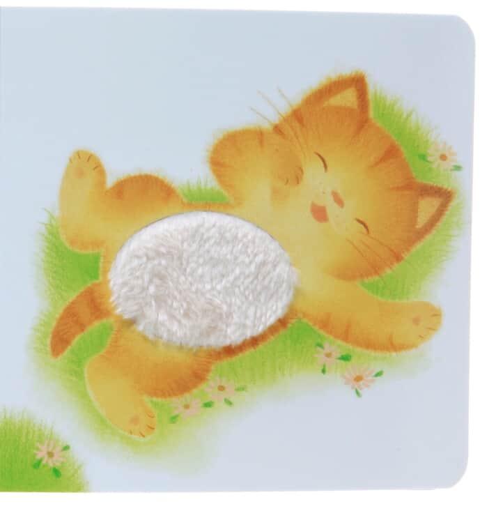 - 『ふわふわ だあれ?』本文ページ。ねこさんのおなかにふわふわ素材が貼り込んであります。