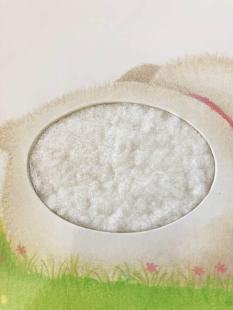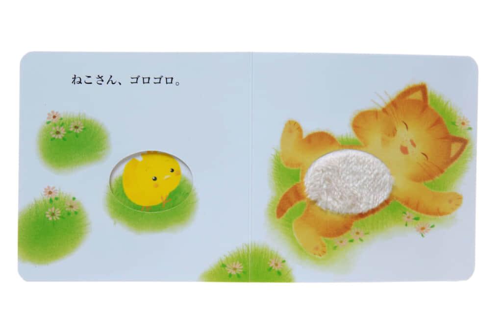 『ふわふわ だあれ?』の最大の特徴は、ふわふわな手触りの布素材が貼り付けてあることです。まだ視力の発達していない乳幼児にとって、手に触れられるものから得る感覚、触覚の情報は大変重要です。
