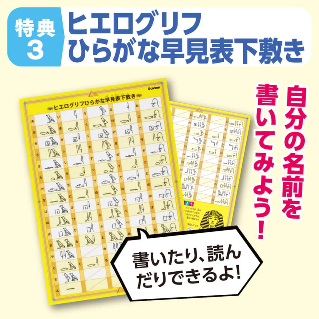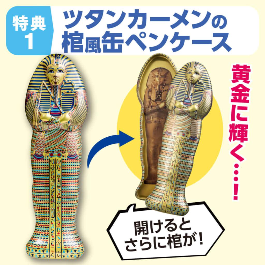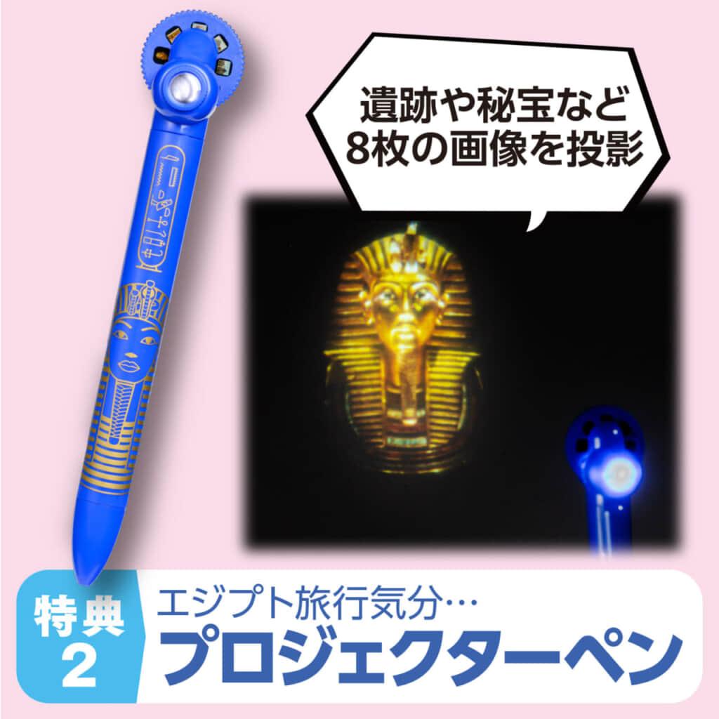 初回限定版セットには、「ツタンカーメンの棺風缶ペンケース」や、エジプトの遺跡や秘宝などの8枚の画像が投影できる「プロジェクターペン」、自分の名前が書ける「ヒエログリフひらがな早見表下敷き」、暗記ブックや歴史年表といった、豪華な5大特典が付属!
