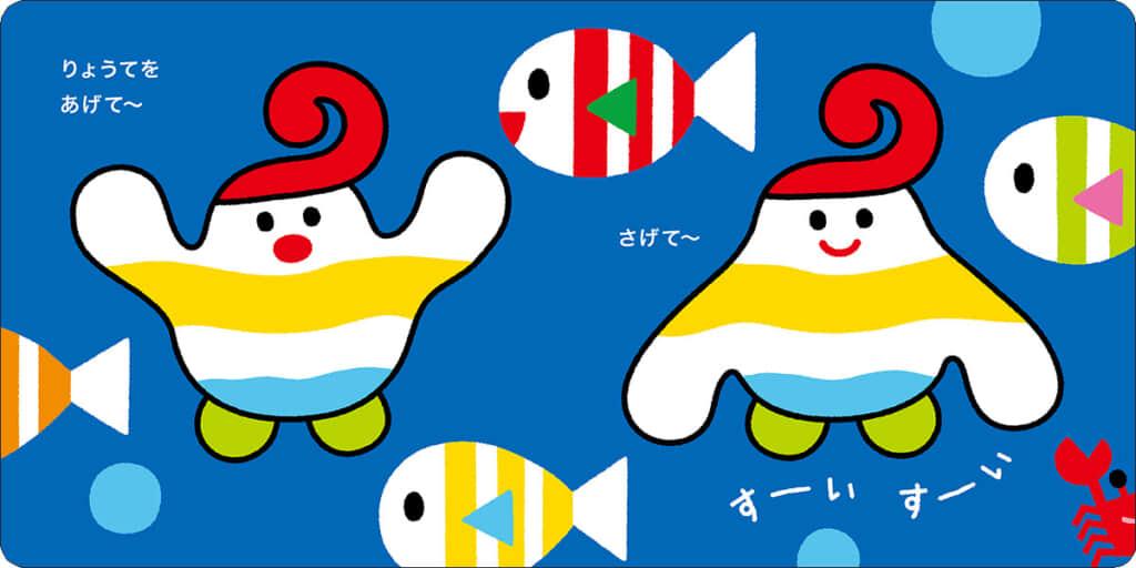 絵本『しましまぐるぐる』みたいに「しましま」で、「ぐるぐる」で、よーく見ると色味もそっくりな、シリーズ初の公式キャラクター「しまぐー」が初登場。シリーズでもおなじみの「いぬ」や「ねこ」、「さかな」、「へび」達と一緒に、元気いっぱい体を動かします。これまで同様、お子さんが注目しやすいコントラストの強い絵柄や「かお」も必見です。