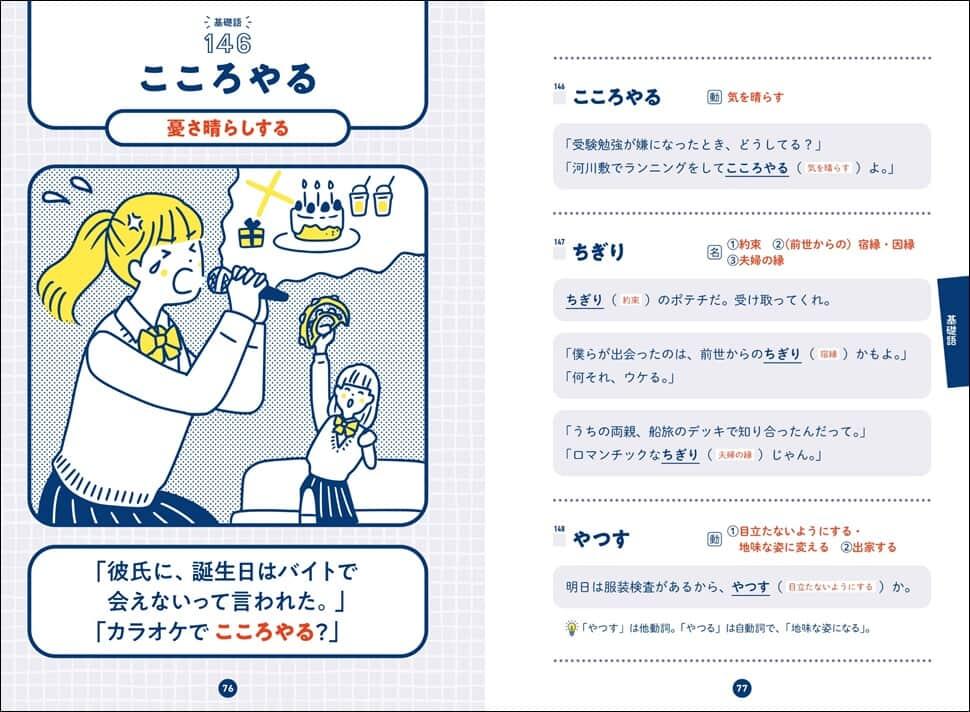 本書は「古文が苦手」「暗記が苦手」な国語編集者が作った、古文単語を日常会話で使って覚える、新感覚の単語帳です。「昨日のドラマ、いとあはれなり。」のように、現代の日常会話の一部に古文単語を用いることで、自然と楽しく単語を覚えられます。