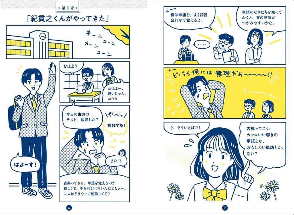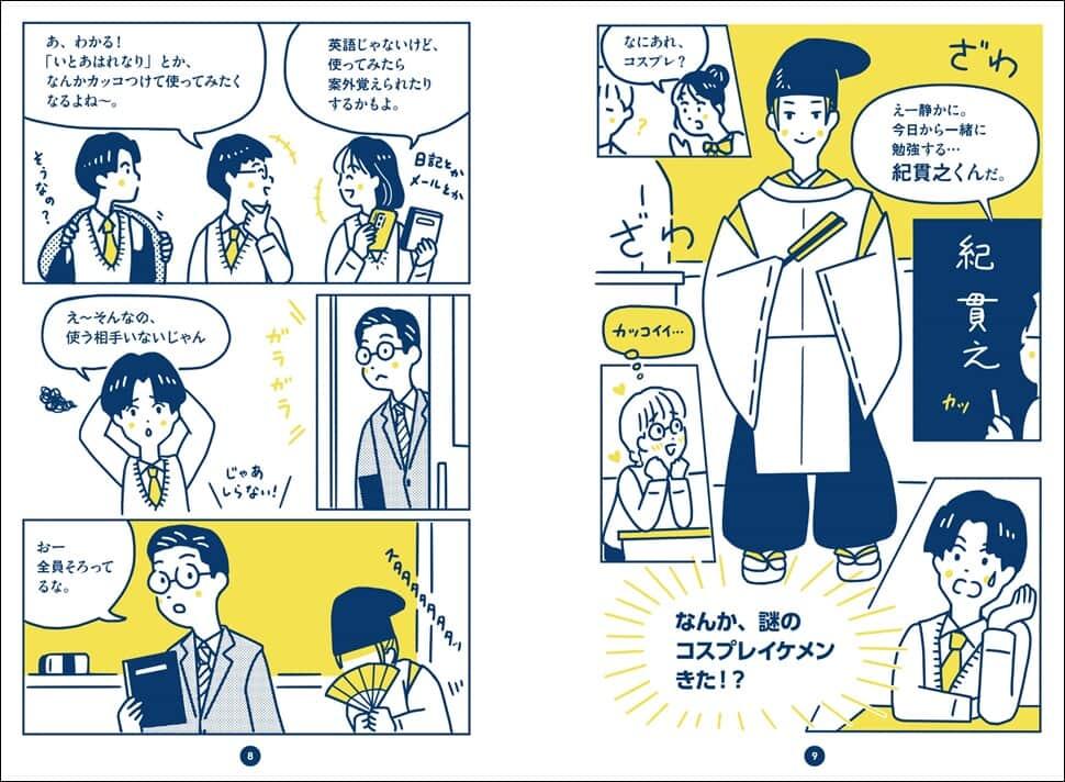 本書では、各章の冒頭に漫画を収録しています。主人公は、古文単語が覚えられないことに悩む高校生。ある日クラスに、古文の授業でおなじみの「紀貫之」が転校してきます。