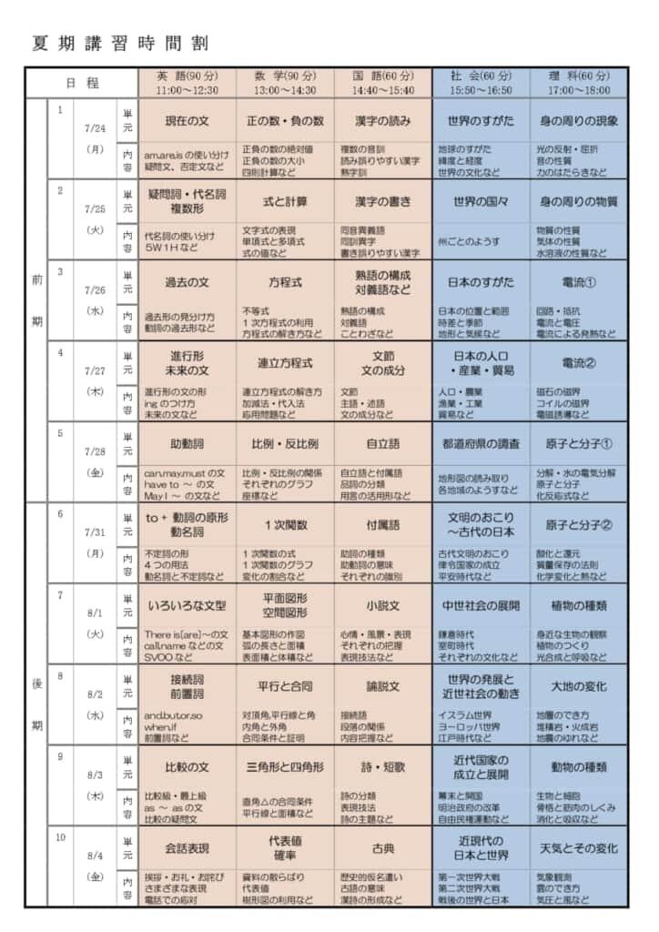 こちらが夏期講習の時間割です。