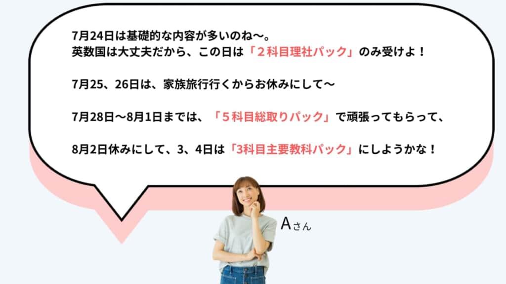 「1日目は基礎の基礎なので2科のみ、2日目は5科、3日目からは家族旅行なので受講しない」なんて受講スタイルも自由自在に組めちゃいます!