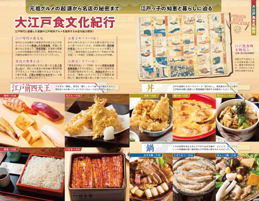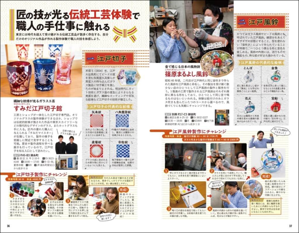 江戸前寿司に天ぷら、蕎麦の御三家、親子丼に深川めしまで名店のおいしさの秘密を徹底リサーチ。職人の技に直接ふれながら自分だけの逸品がつくれる伝統体験は、製作の流れを細かく紹介しています。