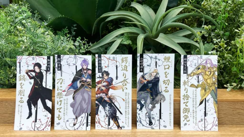 初回限定で始まりの五振り(※)が勢ぞろいする「刀ことば選びの栞」五枚が同梱されます。お気に入りのことばがのっているページに挟んだり、ご自宅で飾ったり、ご活用いただけますと幸いです。