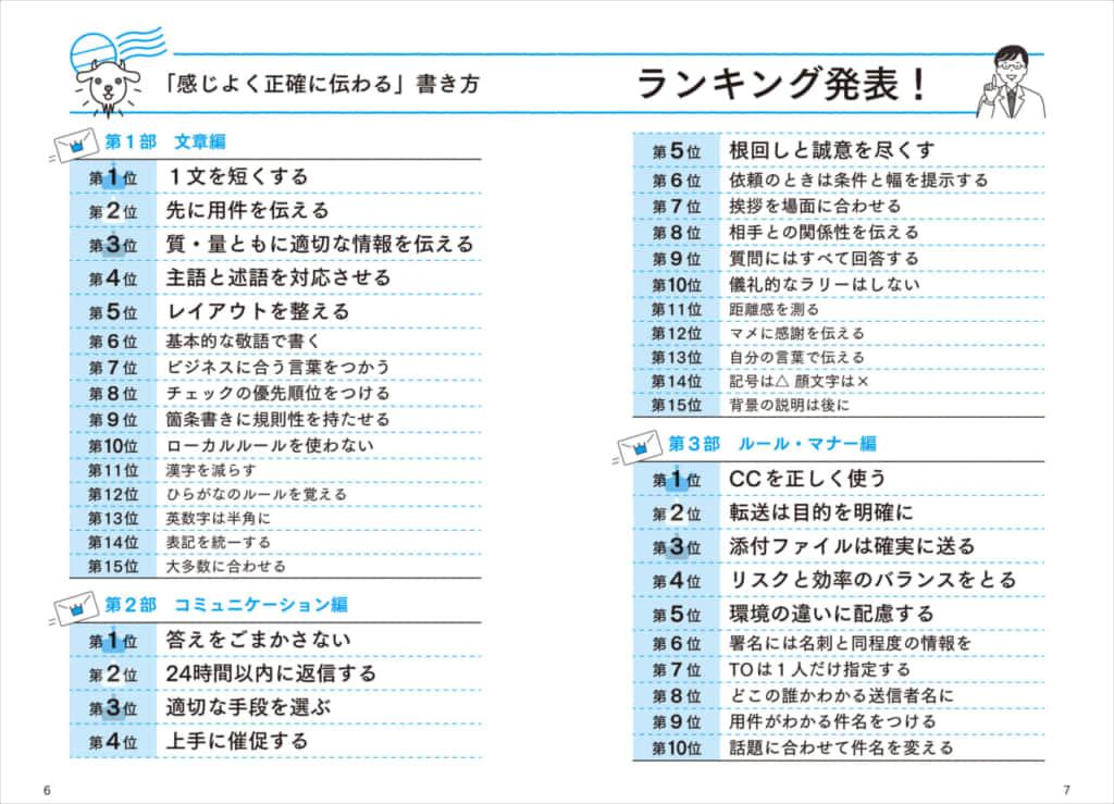 - 「文章編」「コミュニケーション編」「ルール・マナー編」に分けて「感じよく正確に伝わる」メールの書き方をランキング形式でご紹介