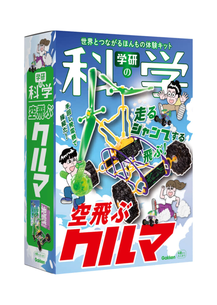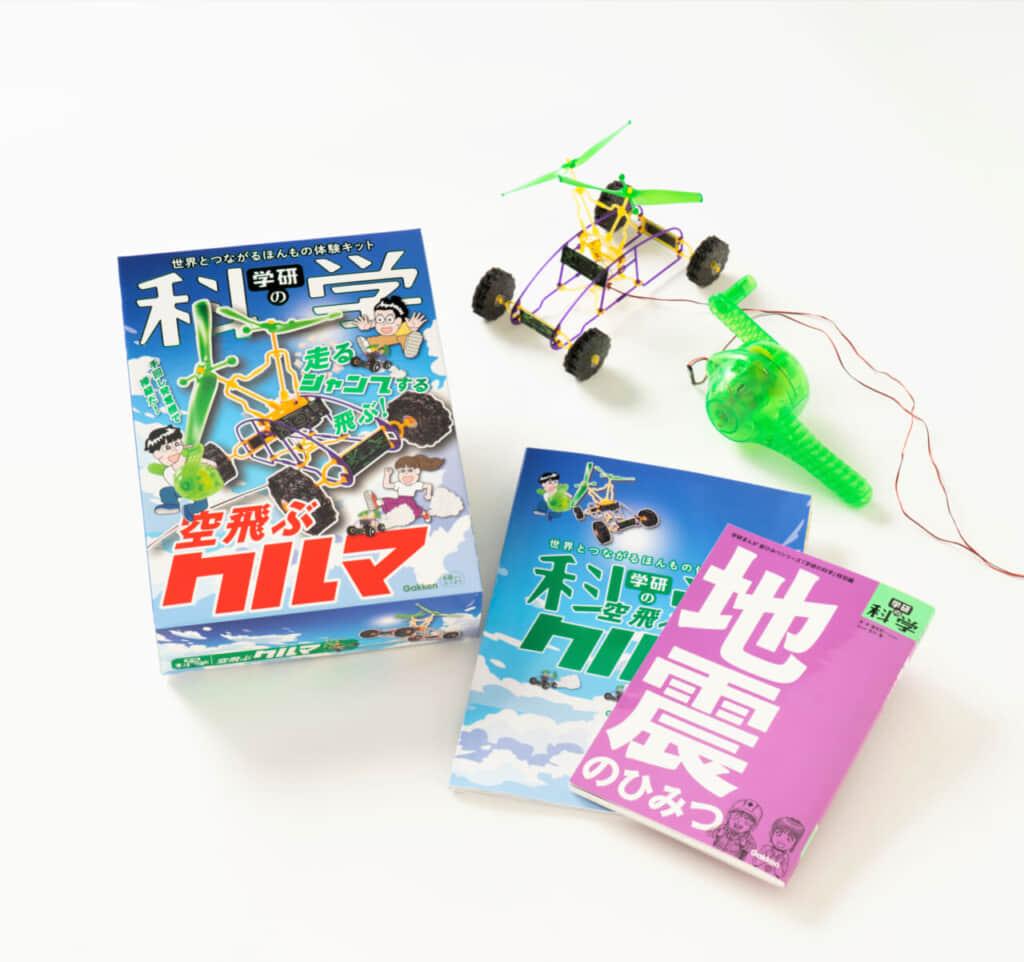 『学研の科学』は実験キットの「空飛ぶクルマ」、実験を多数紹介した本誌、学研まんが「ひみつシリーズ」に加えて、オンラインコミュニティ「あそぶんだ研究所」がセットになってほんものの科学体験をお届けします。