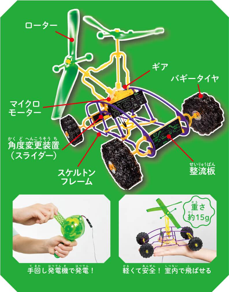 世界中で開発が進められている、近未来の乗り物をいち早く体験できる実験キットです。操縦はかんたん。手回し発電機を回して、クルマ本体に有線で電流を流します。マイクロモーターが2枚のローターを回転させて、クルマが走る・ジャンプする・空を飛ぶという3つの動きを実現します。自分の操縦で、クルマがふわっと浮き上がる体験は子どもを夢中にさせる魅力がいっぱいです。組み立て時間の目安は30分。組み立て方動画を見られるので、お子さまが一人で組み立てることができます。
