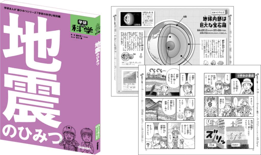 『ひみつシリーズ』は小学生に大人気の学習まんが。身の回りの疑問や知りたいことをわかりやすく解説。1冊のまんがを通して、楽しく知識が身につきます。今回のテーマは地震。地震が起こるメカニズムや、防災の備えについて紹介しています。
