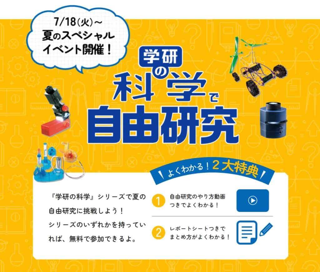 今年の夏は『学研の科学』のキットを使った自由研究ページを開設。実験動画を見たり、まとめ方シートなどをダウンロードしたりすることができます。学研の科学で自由研究はバッチリです!